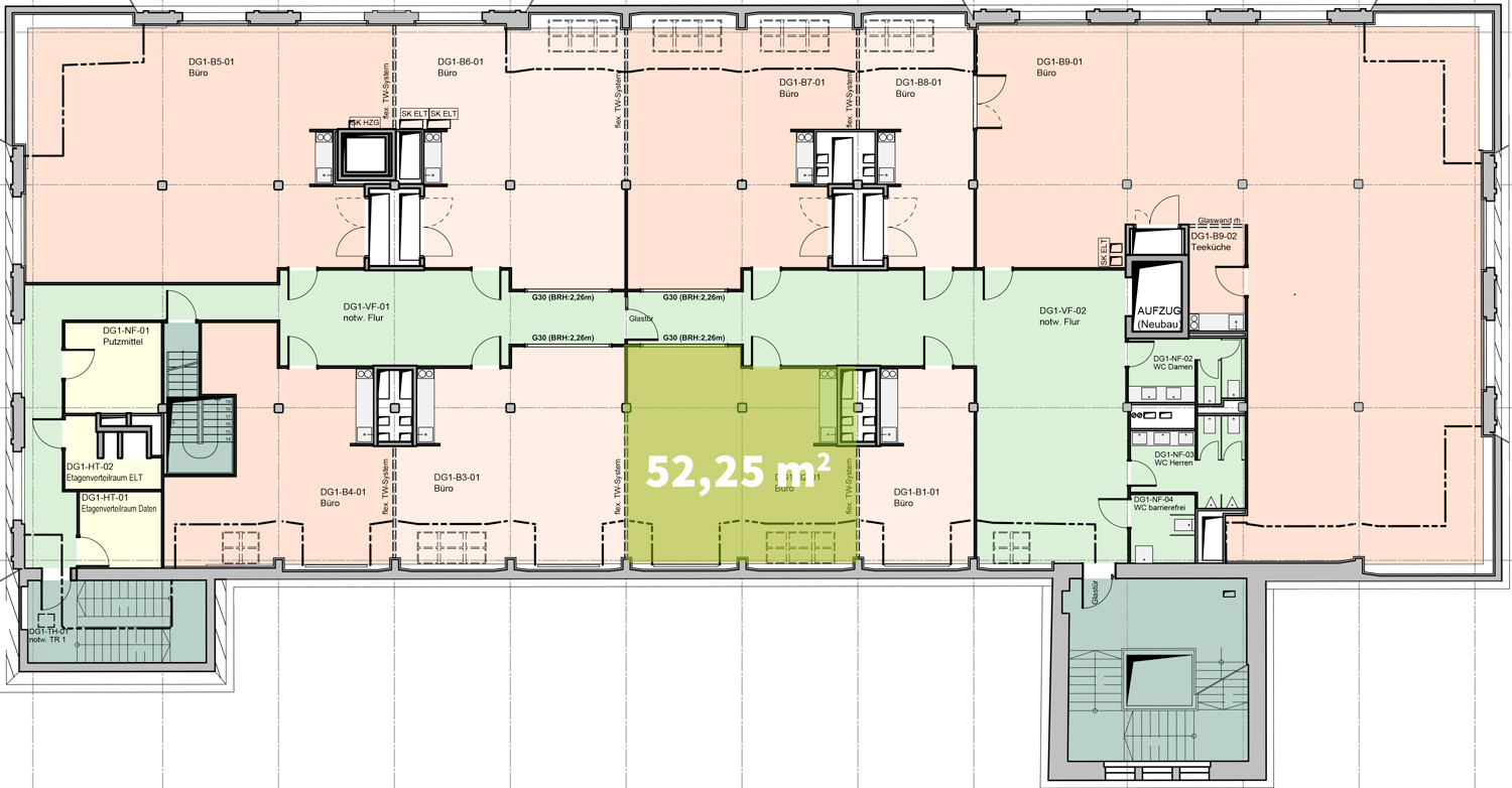 Die angebotene Gewerbeeinheit umfasst einen Raum im 1. Dachgeschoss mit ca. 52,25 m². Das Büro verfügt über eine Kochnische. Die Bürofläche kann über einen Aufzug oder dem Treppenhaus erreicht werden. Die offene Grundrissgestaltung ermöglicht eine flexible Nutzung, angepasst an ihre individuellen Bedürfnisse. Große Fenster an den Außenwänden sorgen durch den Tageslichteinfall für helle Räume.