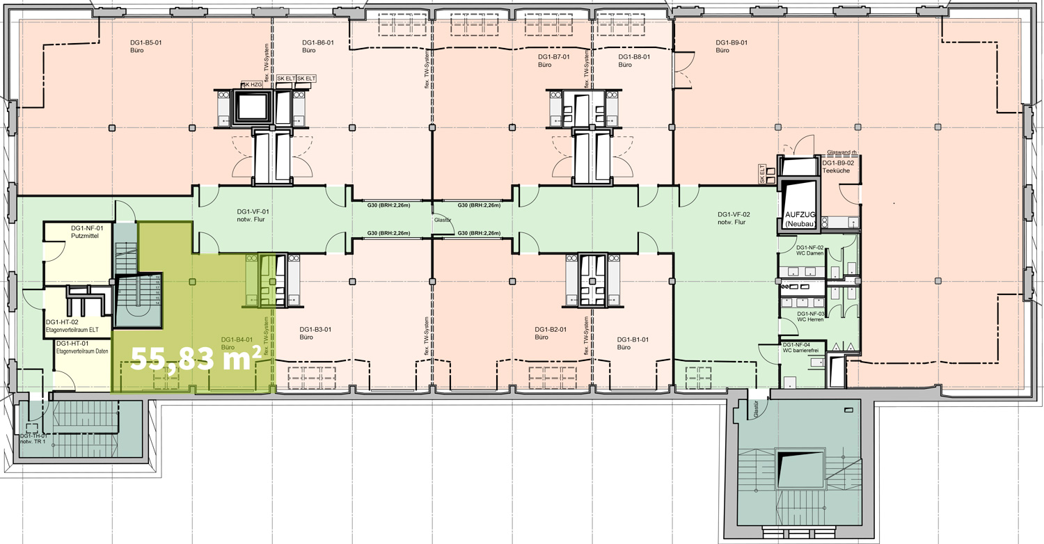 Die angebotene Gewerbeeinheit umfasst einen Raum im 1. Dachgeschoss mit ca. 55,83 m². Das Büro verfügt über eine Kochnische. Die Bürofläche kann über einen Aufzug oder dem Treppenhaus erreicht werden. Die offene Grundrissgestaltung ermöglicht eine flexible Nutzung, angepasst an ihre individuellen Bedürfnisse. Große Fenster an den Außenwänden sorgen durch den Tageslichteinfall für helle Räume.
