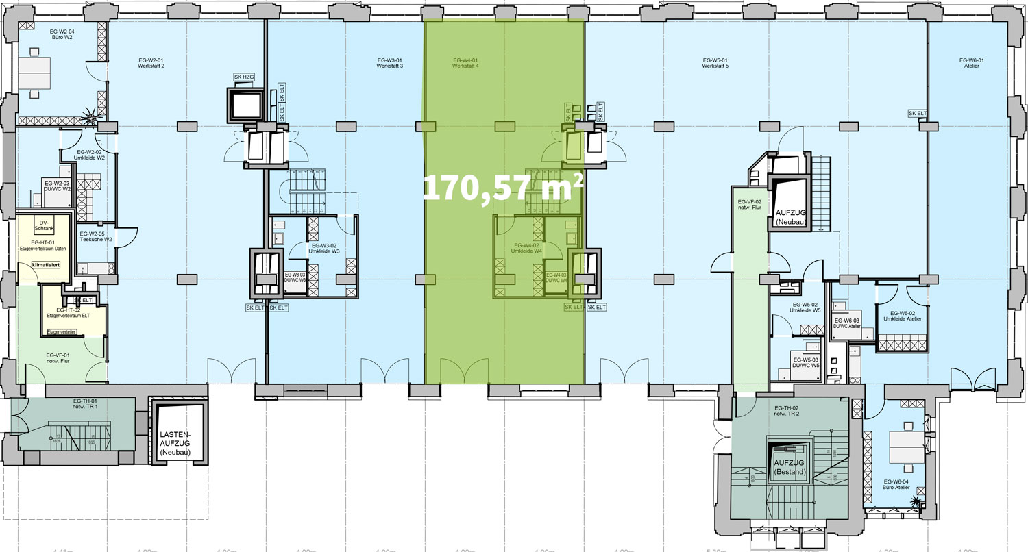 Die angebotene Gewerbeeinheit umfasst einen Raum im Erdgeschoss mit ca. 170,57 m². Darunter ein eigenes Büro, ein eigener Sanitärraum mit Dusche und WC sowie einem weiteren separaten Raum, welcher beispielsweise als Umkleideraum oder Lager genutzt werden kann. Die Werkstattfläche kann über einen eigenen ebenerdigen Eingang erreicht werden.Die offene Grundrissgestaltung ermöglicht eine flexible Nutzung, angepasst an ihre individuellen Bedürfnisse. Große Fenster an den Außenwänden sorgen durch den Tageslichteinfall für helle Räume.