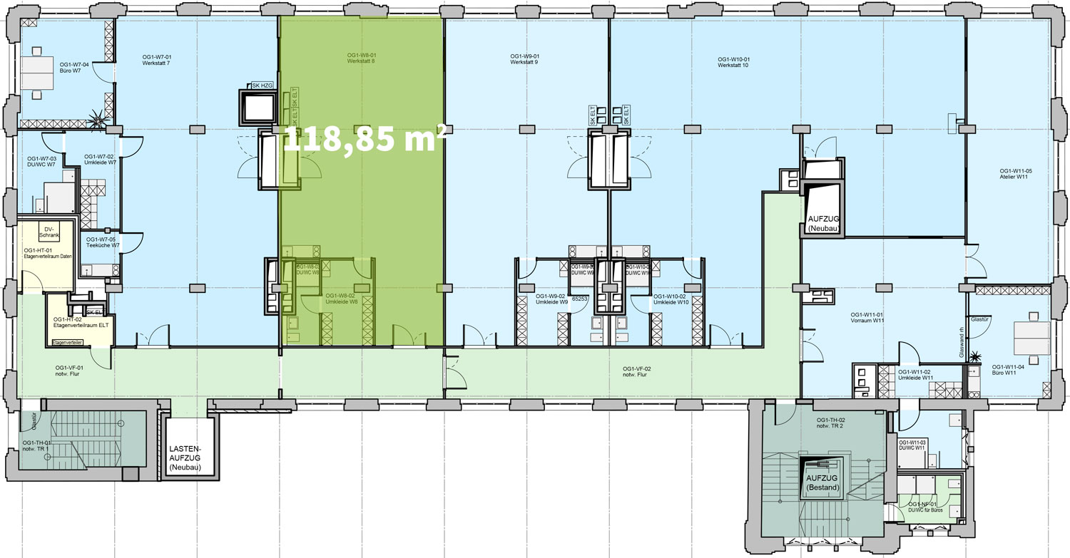 Die angebotene Gewerbeeinheit umfasst einen Raum im 1. Obergeschoss mit ca. 118,85 m². Darunter ein eigenes Büro, ein eigener Sanitärraum mit Dusche und WC sowie einem weiteren separaten Raum, welcher beispielsweise als Umkleideraum oder Lager genutzt werden kann. Die Werkstattfläche kann über einen Aufzug oder dem Treppenhaus erreicht werden. Die offene Grundrissgestaltung ermöglicht eine flexible Nutzung, angepasst an ihre individuellen Bedürfnisse. Große Fenster an den Außenwänden sorgen durch den Tageslichteinfall für helle Räume.